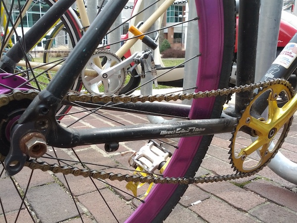 Who says you can't convert an aluminum mountain bike with vertical dropouts? Not this suicide biker. I'm sure the double straps were chosen for comfort (or style). The marginal increase in reliability conferred when using your foot-retention for quick stops would clearly affect your suicide biker cred.